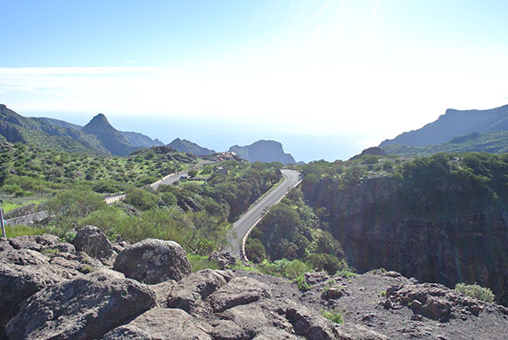 Pour te résumer Masca c’est une petite montagne qui fait partie du massif de Teno. Dans ce coin, on trouve une gorge – les amateurs pourront donc marcher du village de Masca, longer la gorge pour terminer à plage de Masca (il faut compter une dizaine de kilomètres). Nous n’avons pas fait cette marche mais nous avons parcouru la gorge en voiture: les lignes qu’on peut voir autour de la montagne (sur la photo ci-dessous), ce sont des routes. Des routes pas très rassurantes car hautes et étroites. Des routes de montagne quoi. Par-ci, par-là, on a quand même la possibilité de se garer et d’aller marcher dans la montagne ou tout simplement, on peut s’arrêter pour admirer la vue.